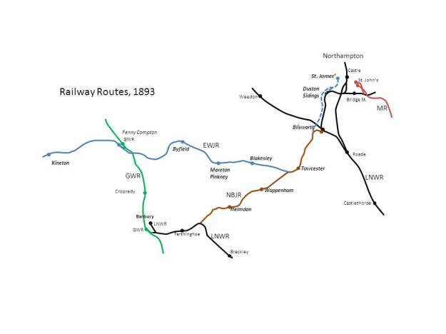The East and West Junction Railway, desirous of gaining more iron ore traffic over its metals, obtained an Act of Parliament in 1888 which enabled it to build a single line over the LNWR just north of Blisworth, to connect with the LNWR Northampton and Peterborough branch between Courteenhall and Rothersthorpe, and to use running powers thence into Northampton Bridge Street. Unfortunately, satisfactory terms for this could not be agreed, and a subsequent Act was granted to enable the EWJR to build its own line to Northampton. During the surveying stage, it became apparent that the cost of making an end-on connection to the Midland at St. John’s station was going to be prohibitive: the line would need to be carried acros the flood plain on a viaduct of sufficient height to carry it clear of the LNWR line to Roade which was by then well under construction, and the LNWR were very likely to mobilise their considerable forces against the proposal. As the Midland had recently had a bruising session over the Settle – Carlisle route which they could hardly afford to build, it was disinclined to support the EWJR in a parliamentary battle and indeed to cough up any of the “necessary”. In the end the proposals were scaled down to a simpler (and more affordable!) scheme involving exchange sidings with the LNWR (and via running powers, the Midland) to the west of Duston West signal cabin, and a terminus in the St. James area of western Northampton – just over the river from the LNWR at Castle Station. With this line built, there was no need for an extension to Ravenstone Wood, either, so that line was never built.